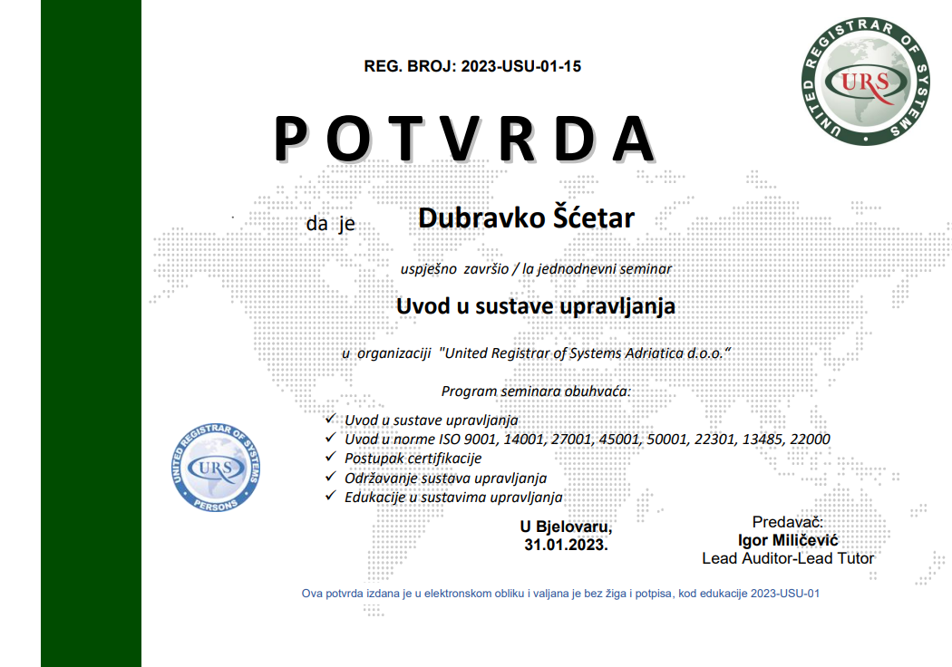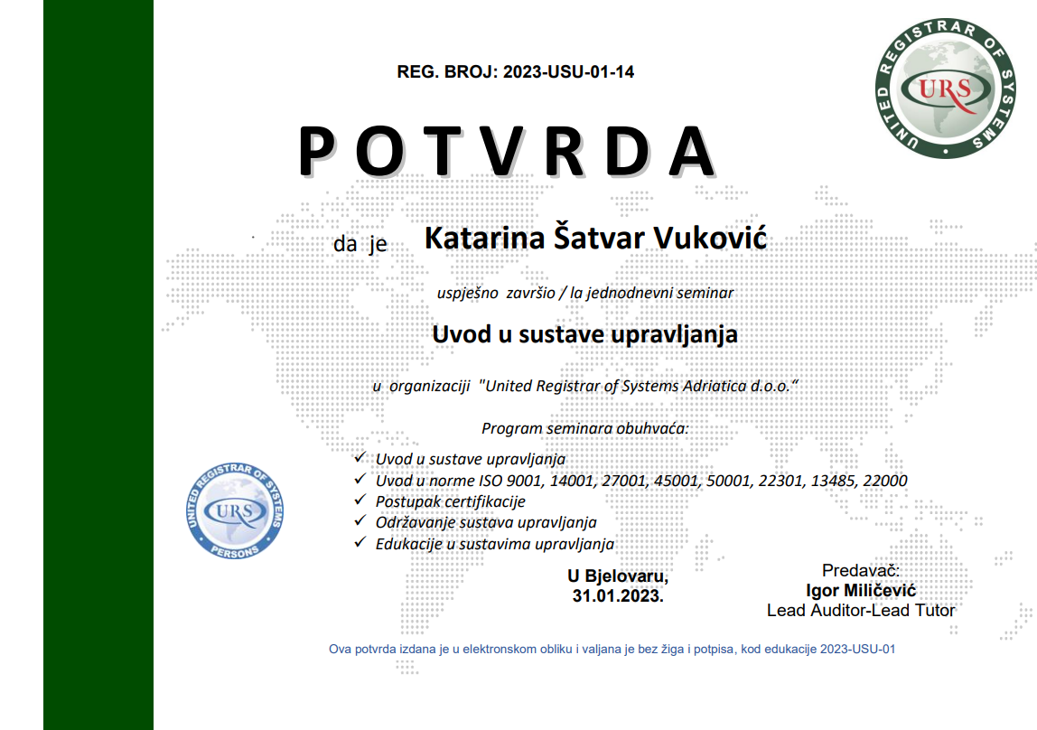 Voditelj Robin integrativne radionice, Dubravko Ščetar i stručna radnica, Katarina Šatvar Vuković sudjelovali su na online seminaru Uvod u sustave upravljanja koji je 31. siječnja 2023. godine bio organiziran preko platforme Teams od strane URS Adriatica d.o.o.